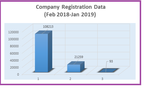 Many companies are registered in the Ministry Of Corporate Affairs every month. According to the data available on the MCA’s website, the approx. units of company registration took place from February 2018 to January 2019 are as follows.